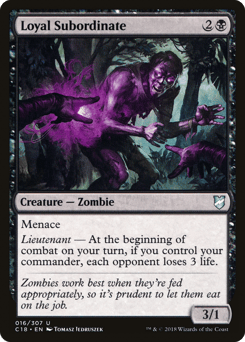 Menace (This creature can't be blocked except by two or more creatures.) Lieutenant — At the beginning of combat on your turn, if you control your commander, each opponent loses 3 life.