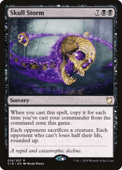 When you cast this spell, copy it for each time you've cast your commander from the command zone this game. Each opponent sacrifices a creature of their choice. Each opponent who can't loses half their life, rounded up.