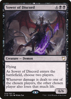 Flying As this creature enters, choose two players. Whenever damage is dealt to one of the chosen players, the other chosen player also loses that much life.
