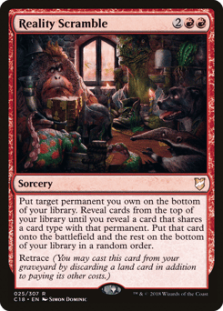 Put target permanent you own on the bottom of your library. Reveal cards from the top of your library until you reveal a card that shares a card type with that permanent. Put that card onto the battlefield and the rest on the bottom of your library in a random order. Retrace (You may cast this card from your graveyard by discarding a land card in addition to paying its other costs.)