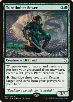 Whenever one or more land cards are put into your graveyard from anywhere, create a 0/1 green Plant creature token. {G}, Sacrifice three creatures: Return target land card from your graveyard to your hand.