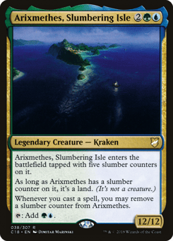 Arixmethes enters tapped with five slumber counters on it. As long as Arixmethes has a slumber counter on it, it's a land. (It's not a creature.) Whenever you cast a spell, you may remove a slumber counter from Arixmethes. {T}: Add {G}{U}.