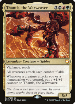 Vigilance, reach All creatures attack each combat if able. Whenever a creature attacks you or a planeswalker you control, put a +1/+1 counter on Thantis.