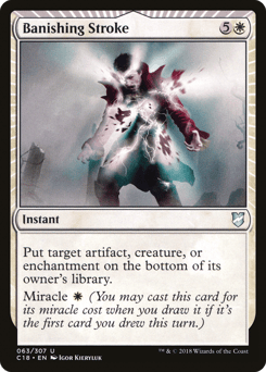 Put target artifact, creature, or enchantment on the bottom of its owner's library. Miracle {W} (You may cast this card for its miracle cost when you draw it if it's the first card you drew this turn.)