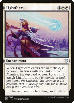 When this enchantment enters, it becomes an Aura with enchant creature. Manifest the top card of your library and attach this enchantment to it. (To manifest a card, put it onto the battlefield face down as a 2/2 creature. Turn it face up any time for its mana cost if it's a creature card.) Enchanted creature has flying and lifelink.