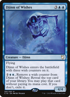 Flying This creature enters with three wish counters on it. {2}{U}{U}, Remove a wish counter from this creature: Reveal the top card of your library. You may play that card without paying its mana cost. If you don't, exile it.