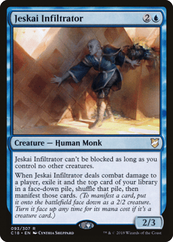 This creature can't be blocked as long as you control no other creatures. When this creature deals combat damage to a player, exile it and the top card of your library in a face-down pile, shuffle that pile, then manifest those cards. (To manifest a card, put it onto the battlefield face down as a 2/2 creature. Turn it face up any time for its mana cost if it's a creature card.)
