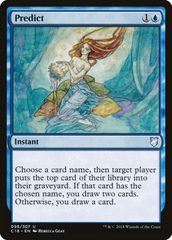 Choose a card name, then target player mills a card. If a card with the chosen name was milled this way, you draw two cards. Otherwise, you draw a card.