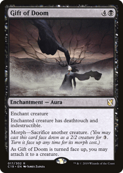 Enchant creature Enchanted creature has deathtouch and indestructible. Morph—Sacrifice another creature. (You may cast this card face down as a 2/2 creature for {3}. Turn it face up any time for its morph cost.) As this Aura is turned face up, you may attach it to a creature.