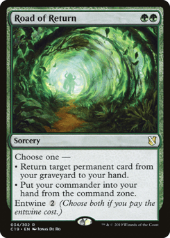 Choose one — • Return target permanent card from your graveyard to your hand. • Put your commander into your hand from the command zone. Entwine {2} (Choose both if you pay the entwine cost.)