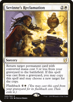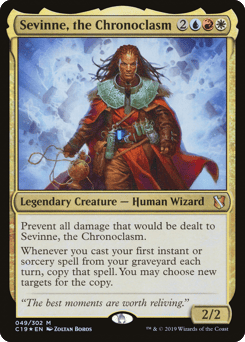Prevent all damage that would be dealt to Sevinne. Whenever you cast your first instant or sorcery spell from your graveyard each turn, copy that spell. You may choose new targets for the copy.