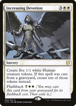 Create five 1/1 white Human creature tokens. If this spell was cast from a graveyard, create ten of those tokens instead. Flashback {7}{W}{W} (You may cast this card from your graveyard for its flashback cost. Then exile it.)