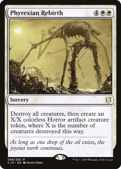 Destroy all creatures, then create an X/X colorless Phyrexian Horror artifact creature token, where X is the number of creatures destroyed this way.