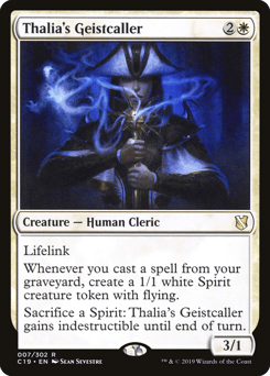 Lifelink Whenever you cast a spell from your graveyard, create a 1/1 white Spirit creature token with flying. Sacrifice a Spirit: This creature gains indestructible until end of turn.