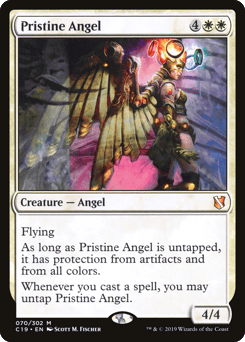 Flying As long as this creature is untapped, it has protection from artifacts and from each color. Whenever you cast a spell, you may untap this creature.