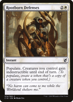 Populate. Creatures you control gain indestructible until end of turn. (To populate, create a token that's a copy of a creature token you control.)