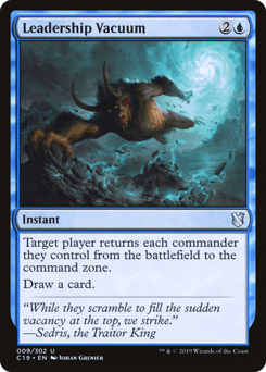 Target player returns each commander they control from the battlefield to the command zone. Draw a card.