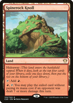 Hideaway 4 (When this land enters, look at the top four cards of your library, exile one face down, then put the rest on the bottom in a random order.) This land enters tapped. {T}: Add {R}. {R}, {T}: You may play the exiled card without paying its mana cost if an opponent was dealt 7 or more damage this turn.
