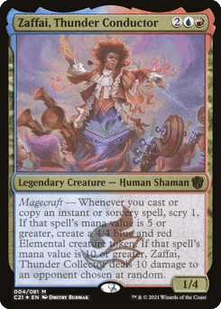 Magecraft — Whenever you cast or copy an instant or sorcery spell, scry 1. If that spell's mana value is 5 or greater, create a 4/4 blue and red Elemental creature token. If that spell's mana value is 10 or greater, Zaffai deals 10 damage to an opponent chosen at random.
