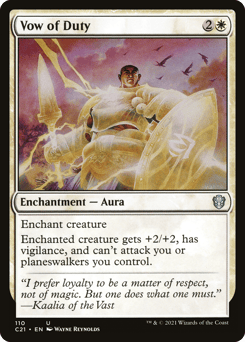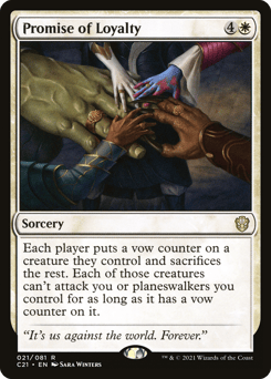 Each player puts a vow counter on a creature they control and sacrifices the rest. Each of those creatures can't attack you or planeswalkers you control for as long as it has a vow counter on it.