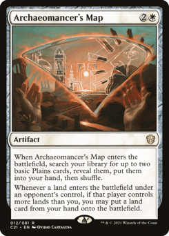 When this artifact enters, search your library for up to two basic Plains cards, reveal them, put them into your hand, then shuffle. Whenever a land an opponent controls enters, if that player controls more lands than you, you may put a land card from your hand onto the battlefield.
