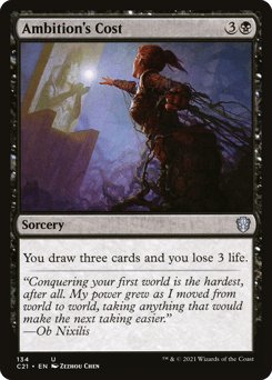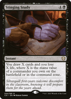 You draw X cards and you lose X life, where X is the mana value of a commander you own on the battlefield or in the command zone.