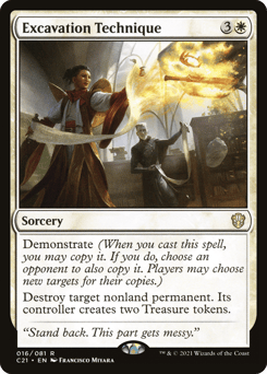 Demonstrate (When you cast this spell, you may copy it. If you do, choose an opponent to also copy it. Players may choose new targets for their copies.) Destroy target nonland permanent. Its controller creates two Treasure tokens.