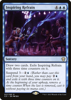 Draw two cards. Exile Inspiring Refrain with three time counters on it. Suspend 3—{2}{U} (Rather than cast this card from your hand, you may pay {2}{U} and exile it with three time counters on it. At the beginning of your upkeep, remove a time counter. When the last is removed, you may cast it without paying its mana cost.)