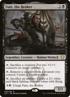 {T}, Sacrifice a creature: Put two +1/+1 counters on target creature. {T}, Remove a counter from a creature you control: Create a Treasure token. {T}, Sacrifice an artifact: Create a 2/1 white and black Inkling creature token with flying. {3}{B}: Untap Fain.