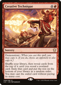 Demonstrate (When you cast this spell, you may copy it. If you do, choose an opponent to also copy it.) Shuffle your library, then reveal cards from the top of it until you reveal a nonland card. Exile that card and put the rest on the bottom of your library in a random order. You may cast the exiled card without paying its mana cost.