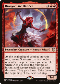 At the beginning of combat on your turn, create X tokens that are copies of another target creature you control, where X is one plus the number of instant and sorcery spells you've cast this turn. They gain haste. Exile them at the beginning of the next end step.