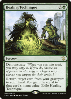 Demonstrate (When you cast this spell, you may copy it. If you do, choose an opponent to also copy it. Players may choose new targets for their copies.) Return target card from your graveyard to your hand. You gain life equal to that card's mana value. Exile Healing Technique.