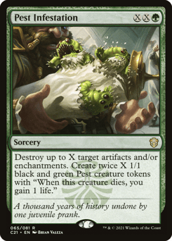 Destroy up to X target artifacts and/or enchantments. Create twice X 1/1 black and green Pest creature tokens with "When this token dies, you gain 1 life."