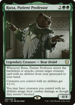 Whenever Ruxa enters or attacks, return target creature card with no abilities from your graveyard to your hand. Creatures you control with no abilities get +1/+1. For each creature you control with no abilities, you may have that creature assign its combat damage as though it weren't blocked.