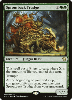 This spell costs {X} less to cast, where X is the amount of life you gained this turn. Trample At the beginning of your end step, if you gained life this turn, you may cast this creature from your graveyard.
