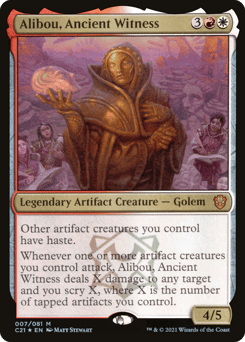 Other artifact creatures you control have haste. Whenever one or more artifact creatures you control attack, Alibou deals X damage to any target and you scry X, where X is the number of tapped artifacts you control.