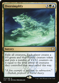 Exile all creatures. Each player creates a 0/0 green and blue Fractal creature token and puts a number of +1/+1 counters on it equal to the total power of creatures they controlled that were exiled this way.