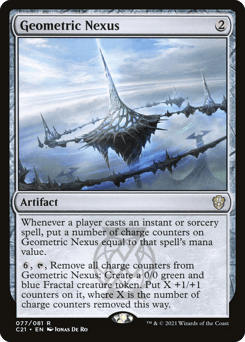 Whenever a player casts an instant or sorcery spell, put a number of charge counters on this artifact equal to that spell's mana value. {6}, {T}, Remove all charge counters from this artifact: Create a 0/0 green and blue Fractal creature token. Put X +1/+1 counters on it, where X is the number of charge counters removed this way.