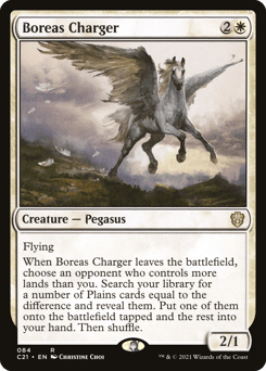 Flying When this creature leaves the battlefield, choose an opponent who controls more lands than you. Search your library for a number of Plains cards equal to the difference, reveal those cards, put one of them onto the battlefield tapped and the rest into your hand, then shuffle.