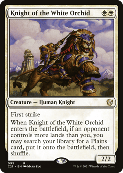 First strike When this creature enters, if an opponent controls more lands than you, you may search your library for a Plains card, put it onto the battlefield, then shuffle.