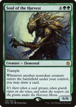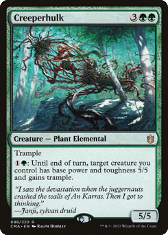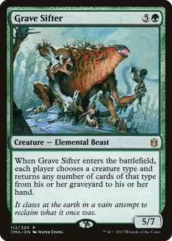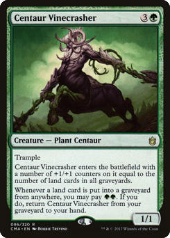 Trample This creature enters with a number of +1/+1 counters on it equal to the number of land cards in all graveyards. Whenever a land card is put into a graveyard from anywhere, you may pay {G}{G}. If you do, return this card from your graveyard to your hand.