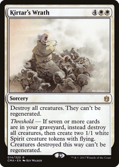 Destroy all creatures. They can't be regenerated. Threshold — If seven or more cards are in your graveyard, instead destroy all creatures, then create two 1/1 white Spirit creature tokens with flying. Creatures destroyed this way can't be regenerated.