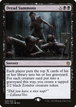 Each player mills X cards. For each creature card put into a graveyard this way, you create a tapped 2/2 black Zombie creature token. (To mill a card, a player puts the top card of their library into their graveyard.)
