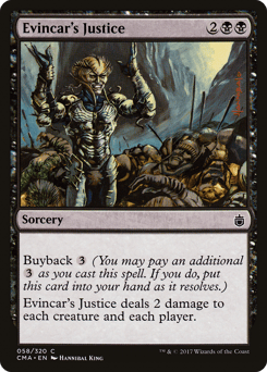 Buyback {3} (You may pay an additional {3} as you cast this spell. If you do, put this card into your hand as it resolves.) Evincar's Justice deals 2 damage to each creature and each player.