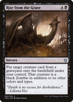 Put target creature card from a graveyard onto the battlefield under your control. That creature is a black Zombie in addition to its other colors and types.