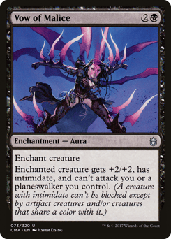 Enchant creature Enchanted creature gets +2/+2, has intimidate, and can't attack you or planeswalkers you control. (A creature with intimidate can't be blocked except by artifact creatures and/or creatures that share a color with it.)