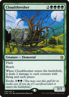 Flash Reach When this creature enters, it deals 2 damage to each creature with flying and each player. Evoke {2}{G}{G} (You may cast this spell for its evoke cost. If you do, it's sacrificed when it enters.)