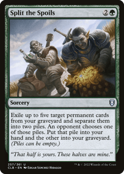 Exile up to five target permanent cards from your graveyard and separate them into two piles. An opponent chooses one of those piles. Put that pile into your hand and the other into your graveyard. (Piles can be empty.)