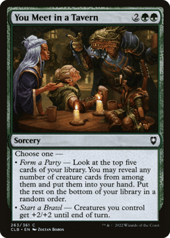Choose one — • Form a Party — Look at the top five cards of your library. You may reveal any number of creature cards from among them and put them into your hand. Put the rest on the bottom of your library in a random order. • Start a Brawl — Creatures you control get +2/+2 until end of turn.