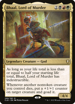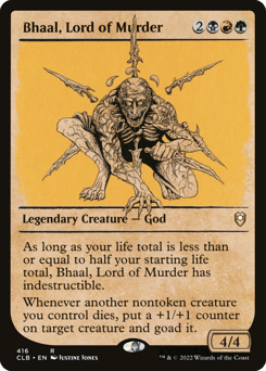 As long as your life total is less than or equal to half your starting life total, Bhaal has indestructible. Whenever another nontoken creature you control dies, put a +1/+1 counter on target creature and goad it.